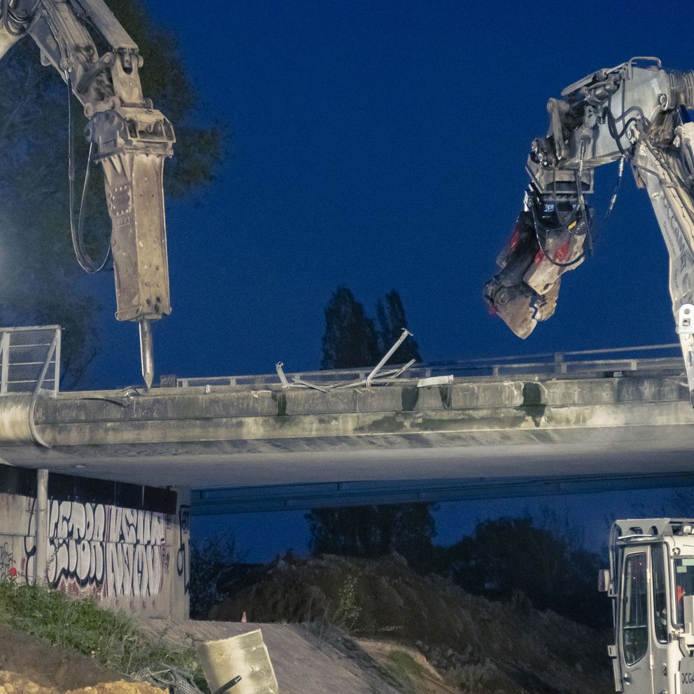 C’est une opération spectaculaire qui vient de se dérouler non loin de l’autoroute A11 à Nantes ! La démolition, dans la nuit du mardi 12 au mercredi 13 avril 2022, du pont de la route de La Chapelle. Une trentaine de personnes ont été mobilisées lors de cet événement exceptionnel. Pas moins de 5 pelles mécaniques de 50 tonnes munies de puissantes croqueuses ont été déployées pour démolir l’ouvrage par « grignotage ». Un lit de sable de 80 cm d’épaisseur a été mis en place sous le pont afin de protéger la chaussée de l’autoroute des chocs liés aux chutes de matériaux. 2 300 tonnes de sable et de matériaux issus de la démolition ont été stockées provisoirement sur la zone de chantier. Les gravats et le sable ont ensuite été acheminés jusqu’à un dépôt situé à Saint-Herblain pour y être triés et stockés. Les gravats en béton seront ensuite concassés pour être réutilisés sur d’autre chantiers de la métropole nantaise, notamment pour la réalisation de trottoirs.
