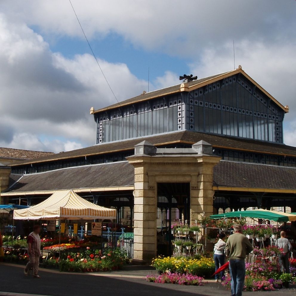 Au cœur de la place se trouvent les halles. A la fin du XIXe siècle, une structure en fonte, supportée par de beaux chapiteaux corinthiens en fer forgé, a remplacé la halle d’origine, en bois. Plus tard, une verrière sera posée sur la halle, lui donnant un aspect proche de celle de Baltard. Huit portes de pierre permettent d’accéder à l’intérieur de la halle, où se tient chaque semaine un marché mélangeant produits locaux et artisanat. Des animations sont régulièrement organisées, avec notamment le festival de jazz des 24h du Swing. Une façon de faire revivre le temps des ménestrels, avec le saxophone en guise de viole de gambe et la contrebasse pour remplacer le cornet à bouquin.