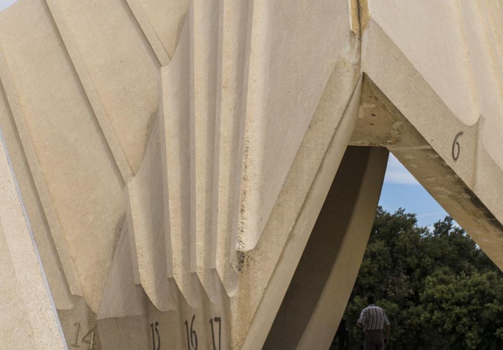 Ce nouvel épisode de Kilomètre-art vous plonge dans l’histoire passionnante de la Nef solaire. Erigée en 1993 sur l’aire de Tavel nord sur l’autoroute A9 dans le Gard provençal, cette sculpture monumentale de 17 mètres de haut est l’un des plus grands cadrans solaires au monde. Ces trois pyramides de béton qui s’élèvent vers le ciel sont l’œuvre de la sculptrice Odile Mir, de l’astronome Denis Savoie et de l’ingénieur Robert Queudot. Denis Savoie, seulement âgé de 25 ans quand il a collaboré à ce projet, explique d’abord que la Nef solaire est composée de 4 voiles dont 3 servent à la lecture de l’heure. L’astronome précise que c’est la projection de l’ombre des styles prismatiques sur ces voiles qui permet ce mécanisme. Il vous encourage par ailleurs à entrer à l’intérieur de la Nef ! En effet, cette impressionnante « montagne » de béton blanc se visite comme une cathédrale.